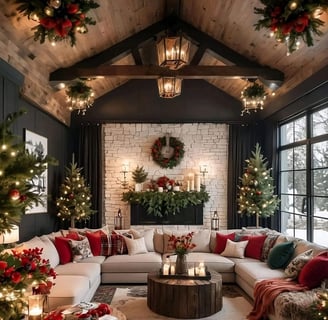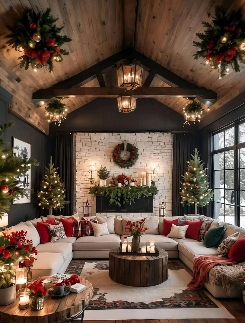 A cozy living room is decorated for the Christmas season. The room features a large sectional sofa covered in plush white fabric and adorned with red and green throw pillows. A rustic wooden coffee table sits in the center of the room, surrounded by candles and a beautiful flower arrangement. The fireplace is adorned with a festive wreath and garland, while the windows are draped with long, black curtains. The ceiling is made of exposed wooden beams and is decorated with Christmas greenery and twinkling lights. The overall ambiance of the room is warm, inviting, and festive.